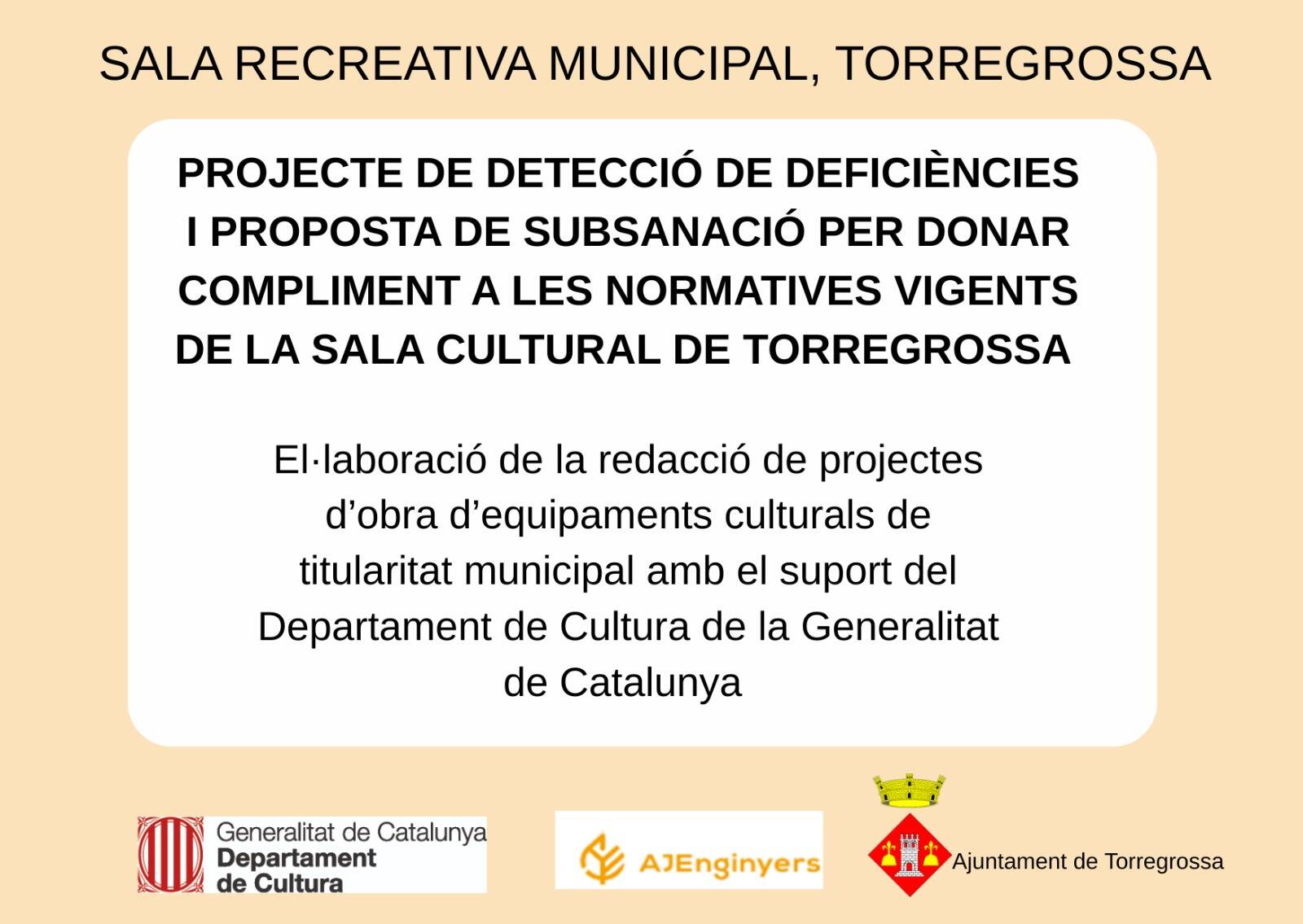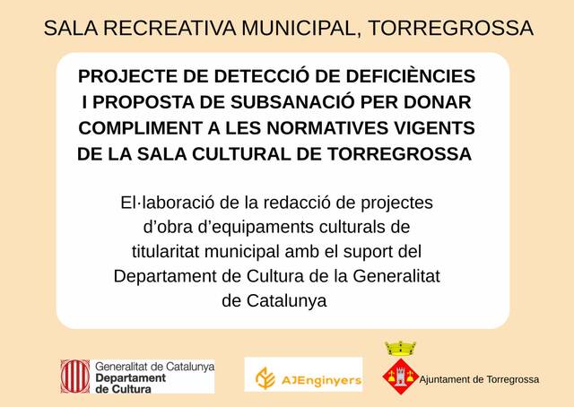 L’Ajuntament de Torregrossa ha posat en marxa el "Projecte de detecció de deficiències i proposta de subsanació per donar compliment a les normatives vigents de la Sala Cultural de Torregrossa".