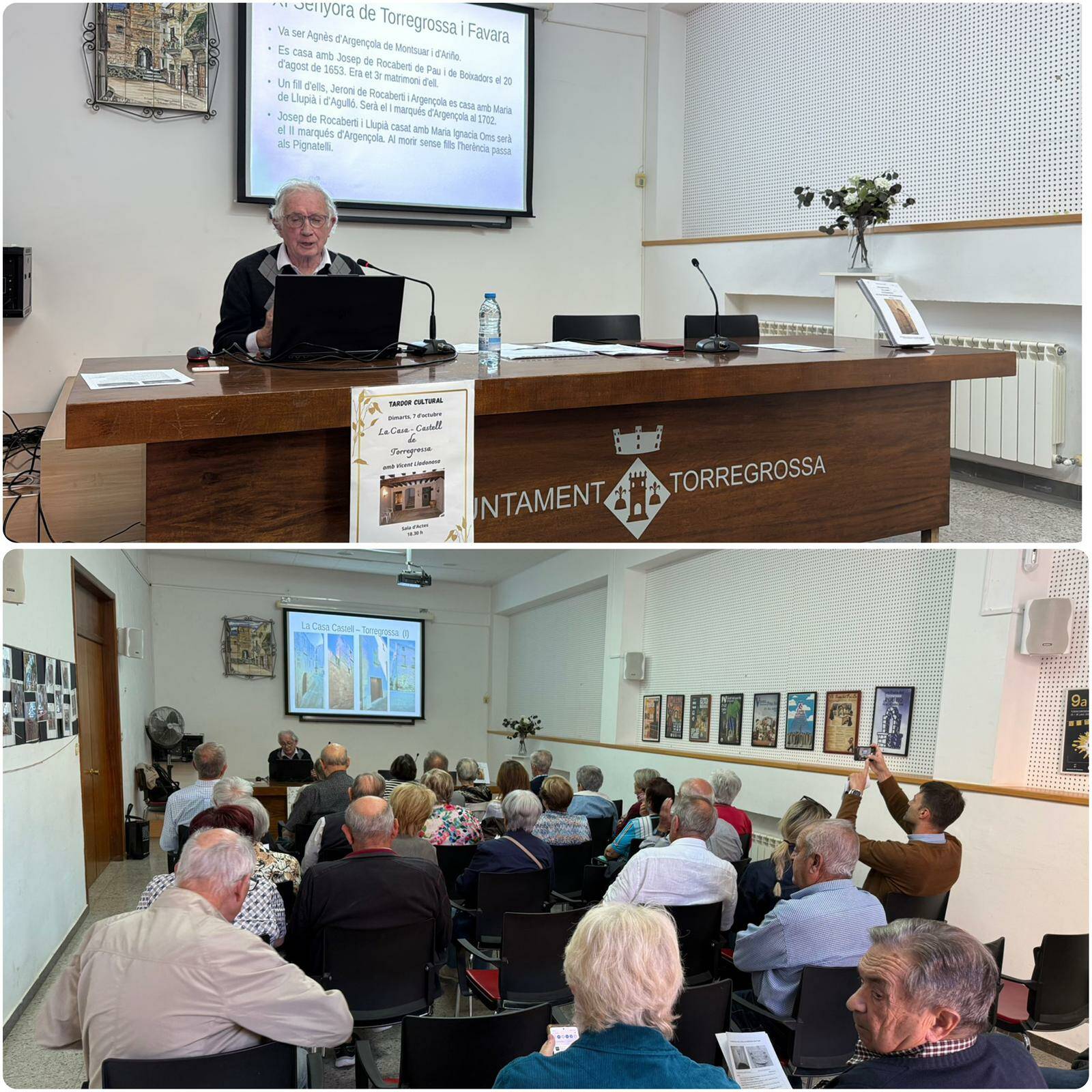 Dins la Tardor Cultural 2025 de Torregrossa, xerrada a la Biblioteca M.Mercè Marçal de l'historiador local Vicent Lladonosa sobre la Casa-Castell de Torregrossa, habitada inicialment pel noble Sr. de Torregrossa fins arribar a la família Bernat Vigatà, avantpassats de l’actual propietari.